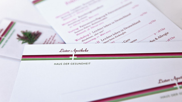 Die neue Lister Apotheke – Haus der Gesundheit setzte 2005 unter der Leitung von Dr. Brigitte Seegerer mit einem neuem Servicekonzept, mit eigenen Produkten und mit dem neuem Corporate Design bewusst Akzente gegen den servicefeindlichen Discountapotheken-Trend. Die Zukunftsapotheke als beinahe magischer Ort verbindet vertrauenswürdige Beratung mit Freude für Ästhetik und Wohlfühl-Atmosphäre. Produkte aus eigener Herstellung in schlichter doch elegenater Verpackung runden die Palette ab. Apothekenkunst — neu entdeckt.