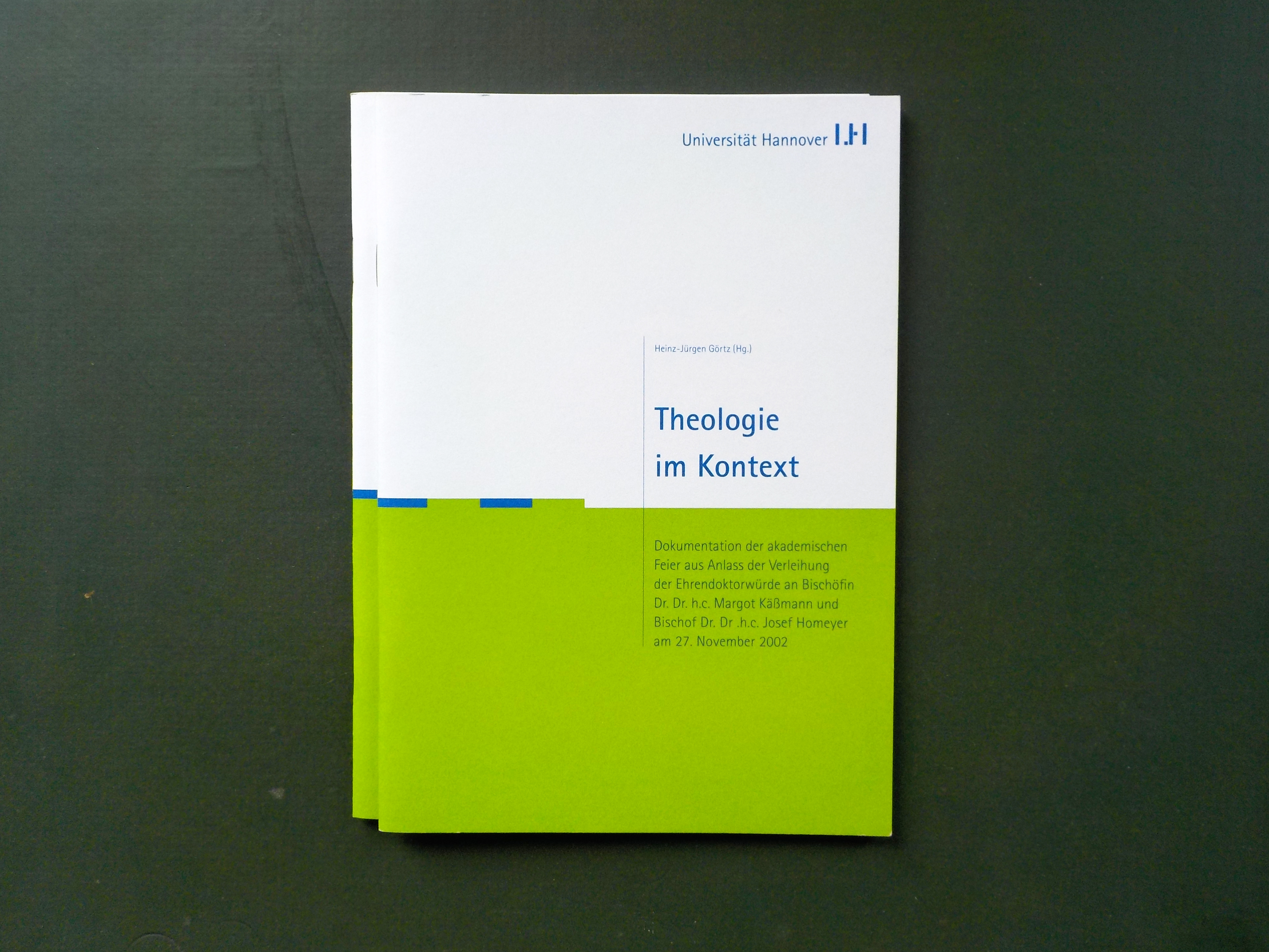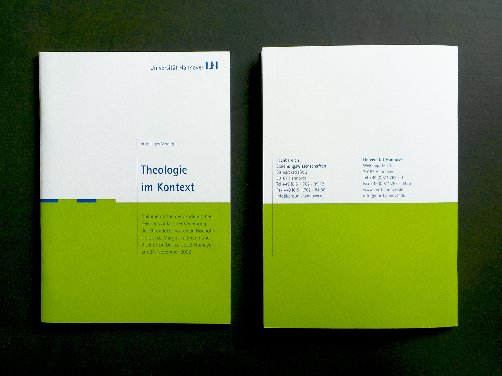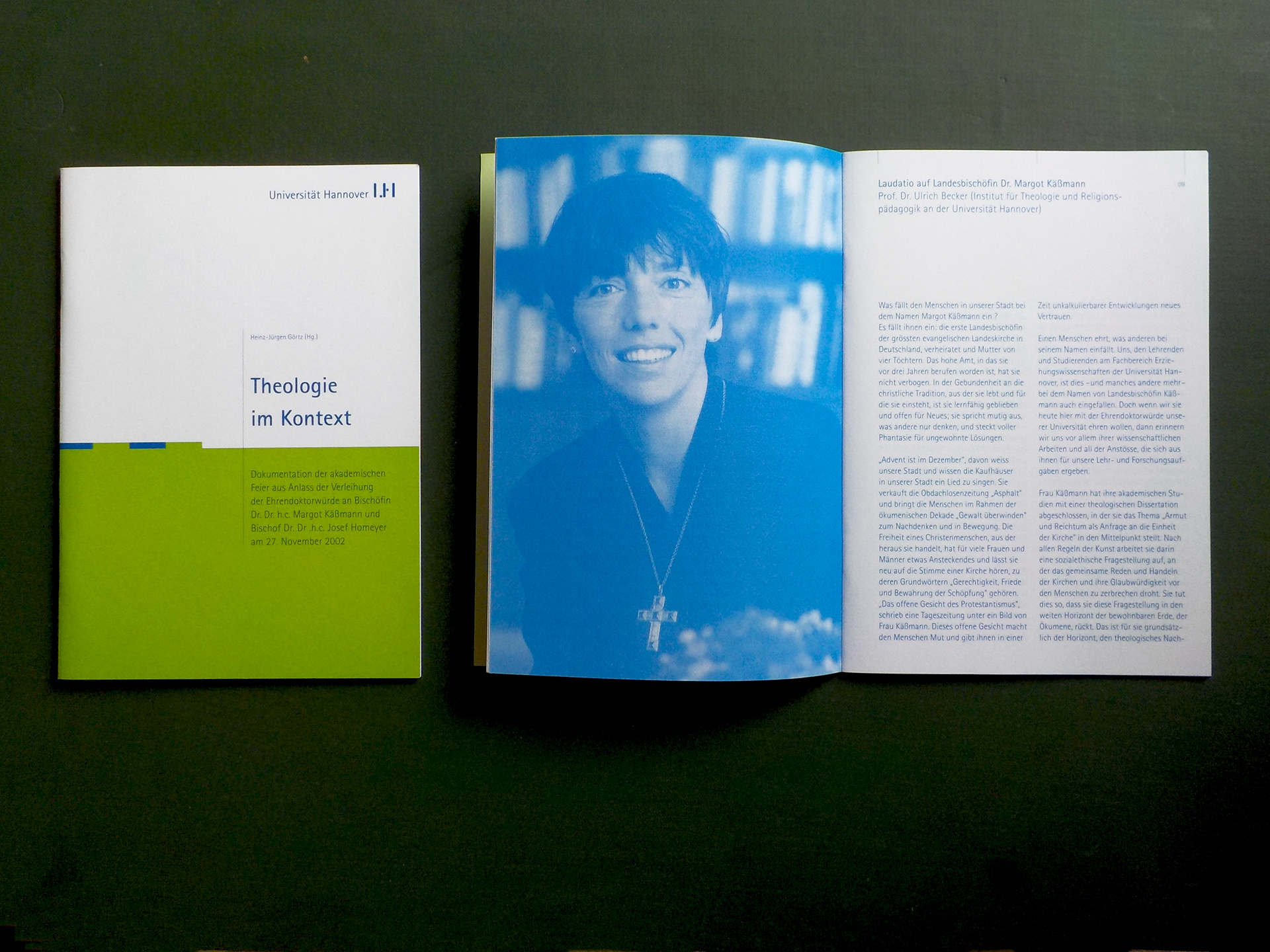 Zweifarbige Broschüre zur Dokumentation der akademischen Feier aus Anlass der Verleihung der Ehrendoktorwürde an Bischöfin Dr. Dr. h.c. Margot Käßmann und Bischof Dr. Dr. h.c. Josef Homeyer am 27. November 2002 für die Universität Hannover