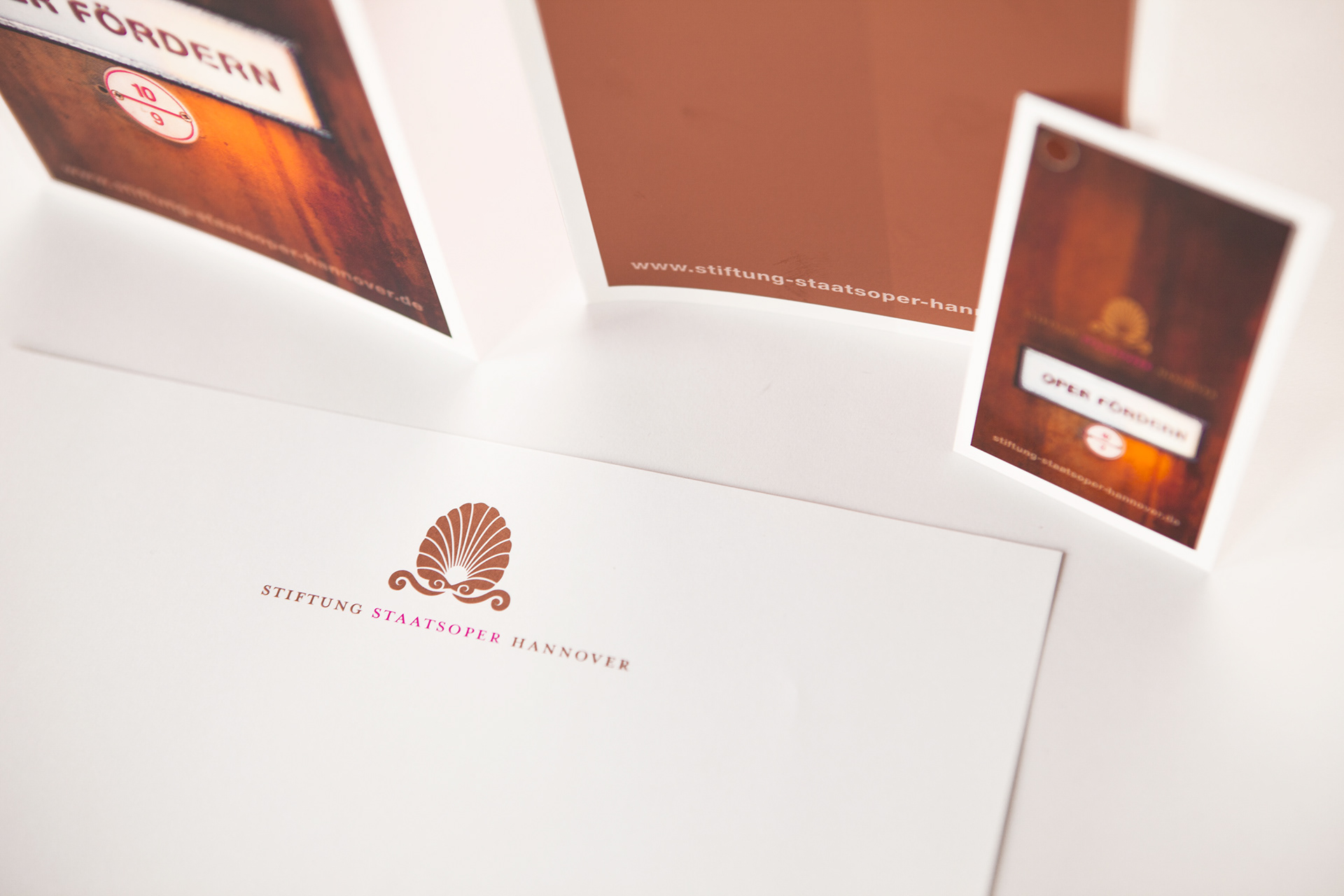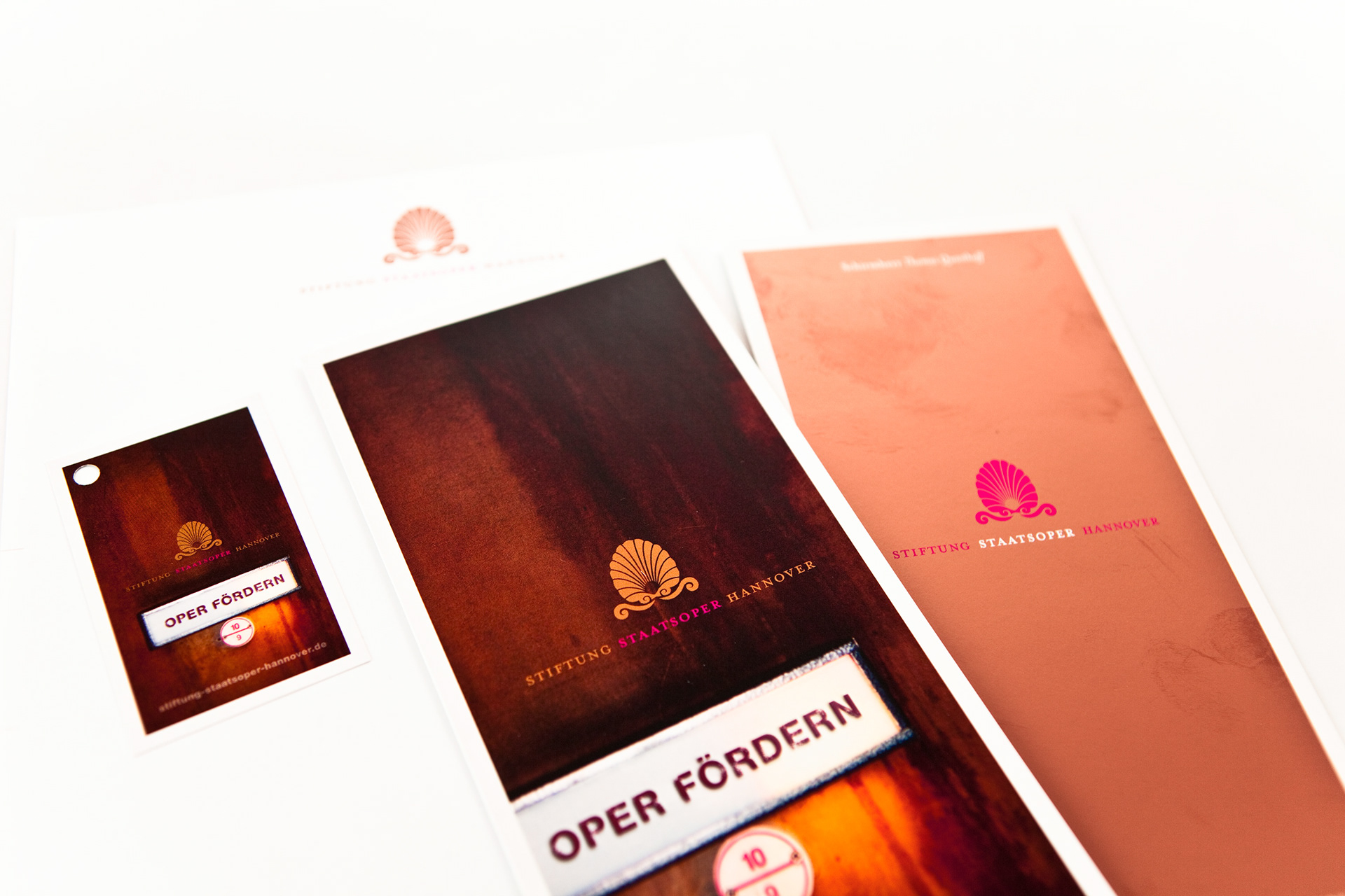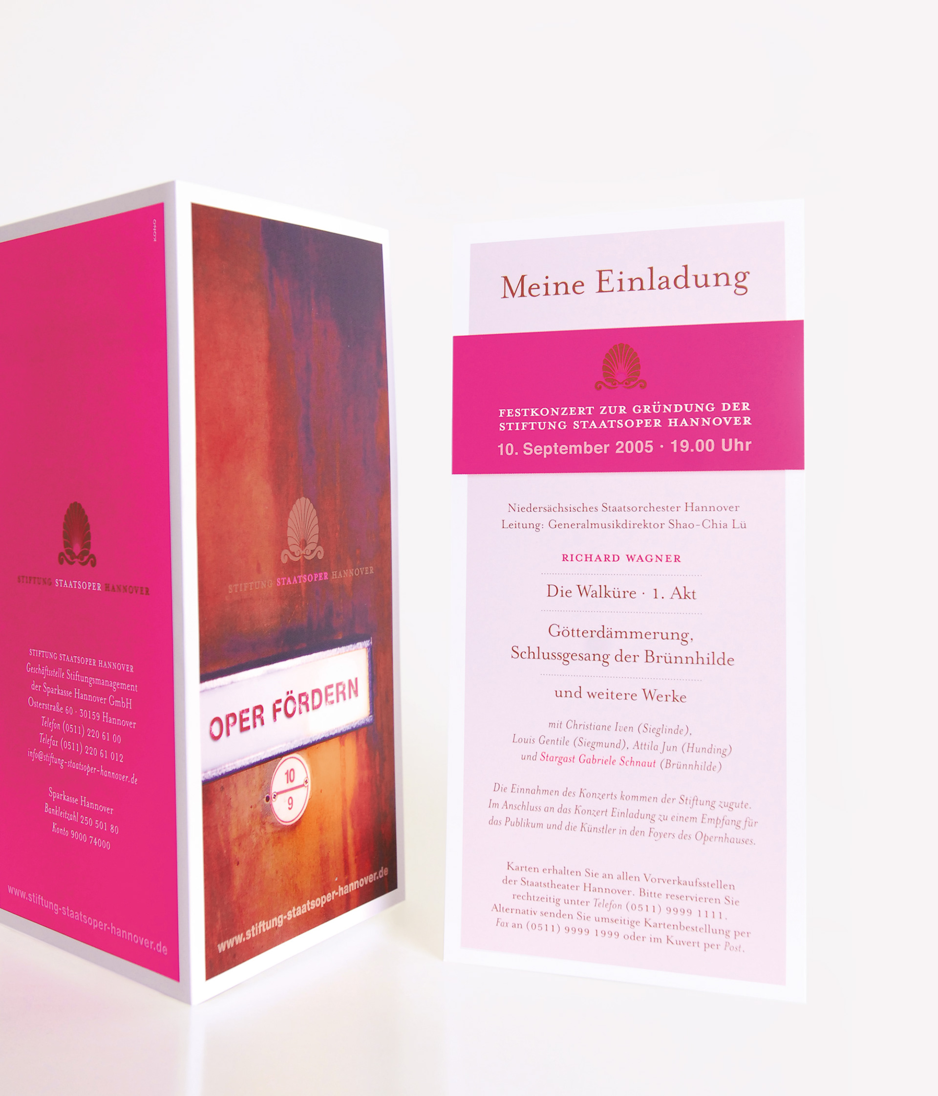 Alt und jung sollten gleichermaßen angesprochen werden — um Oper zu fördern. Das Erscheinungsbild der neu gegründeten Stifung löst dies mittels Farbe (Kombination Kupfer/pink) und mit einem abstrahierten Fassadenelement als Markensymbol. Muschelform wie auch Fotomotiv aus dem Opernhaus unterstützen die Identifikation mit Ort und Institution. Es entstanden Markenzeichen, Geschäftsausstattung, Stifternadel mit Muschelsymbol, Informationsfolder, Infokarte, Einladungskarte, Anhängekärtchen und ein einfacher Webauftritt.