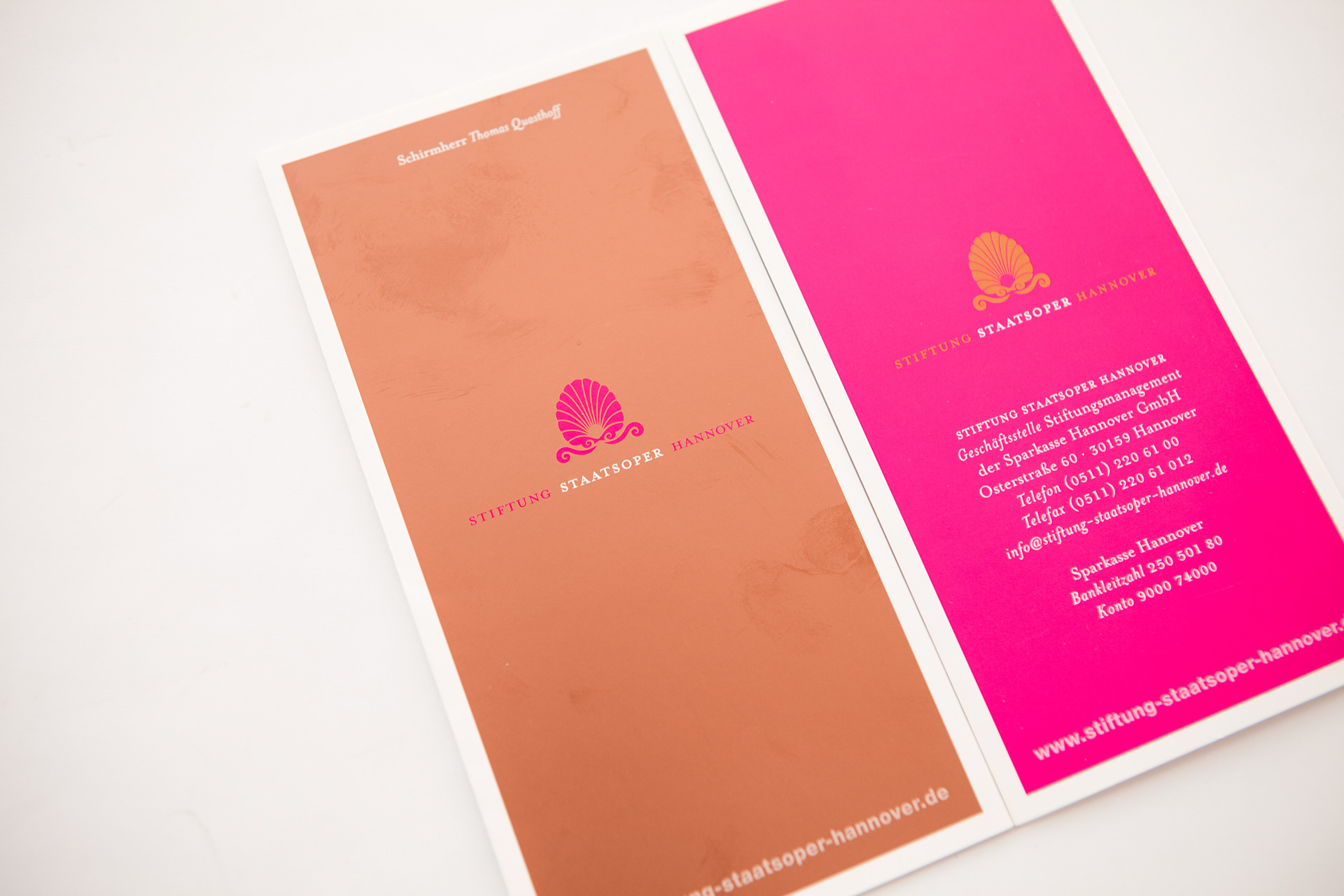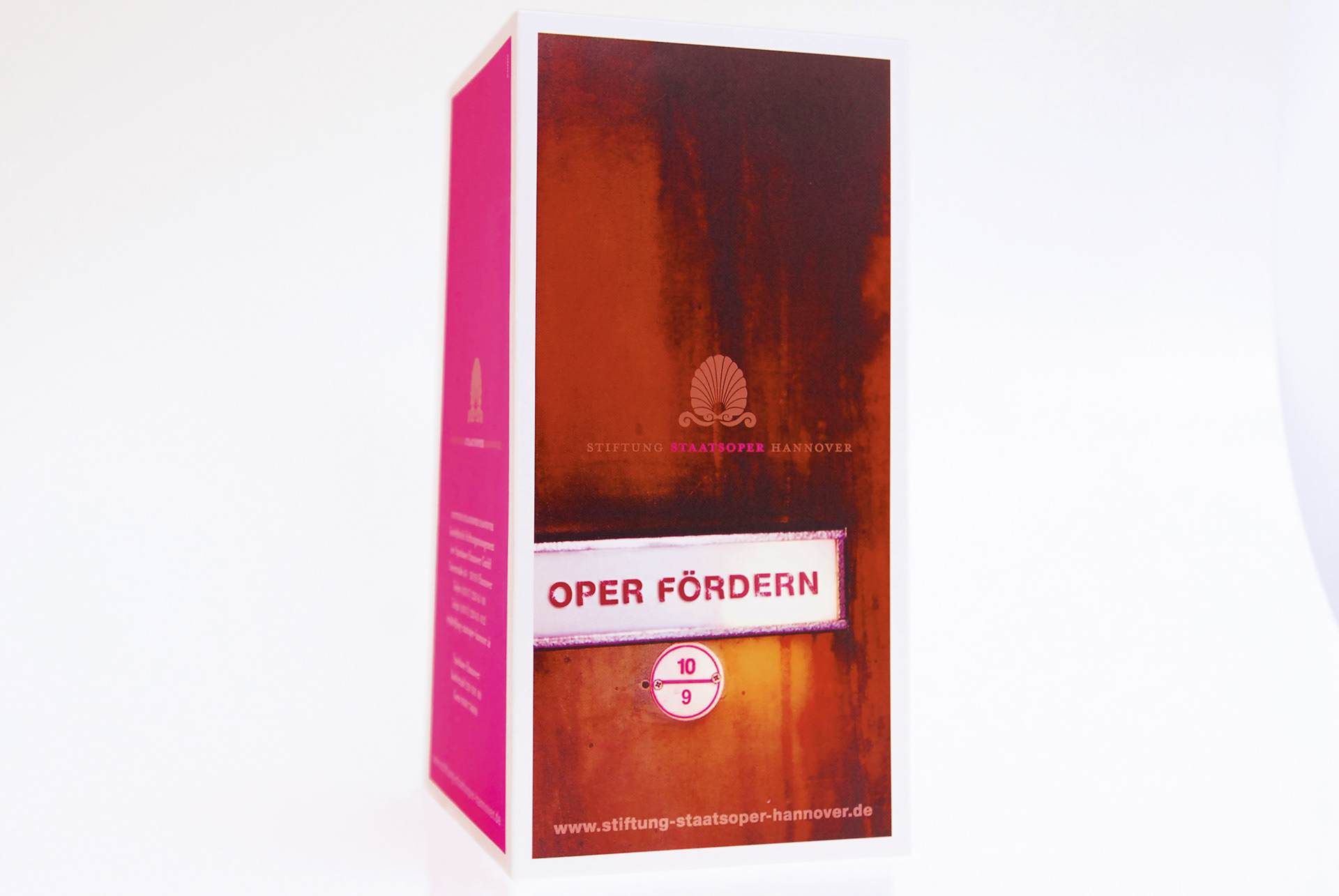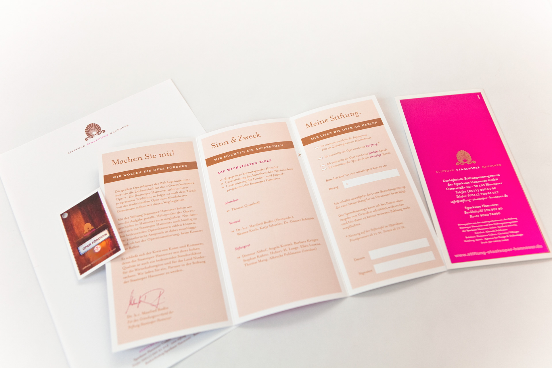 Alt und jung sollten gleichermaßen angesprochen werden — um Oper zu fördern. Das Erscheinungsbild der neu gegründeten Stifung löst dies mittels Farbe (Kombination Kupfer/pink) und mit einem abstrahierten Fassadenelement als Markensymbol. Muschelform wie auch Fotomotiv aus dem Opernhaus unterstützen die Identifikation mit Ort und Institution. Es entstanden Markenzeichen, Geschäftsausstattung, Stifternadel mit Muschelsymbol, Informationsfolder, Infokarte, Einladungskarte, Anhängekärtchen und ein einfacher Webauftritt.
