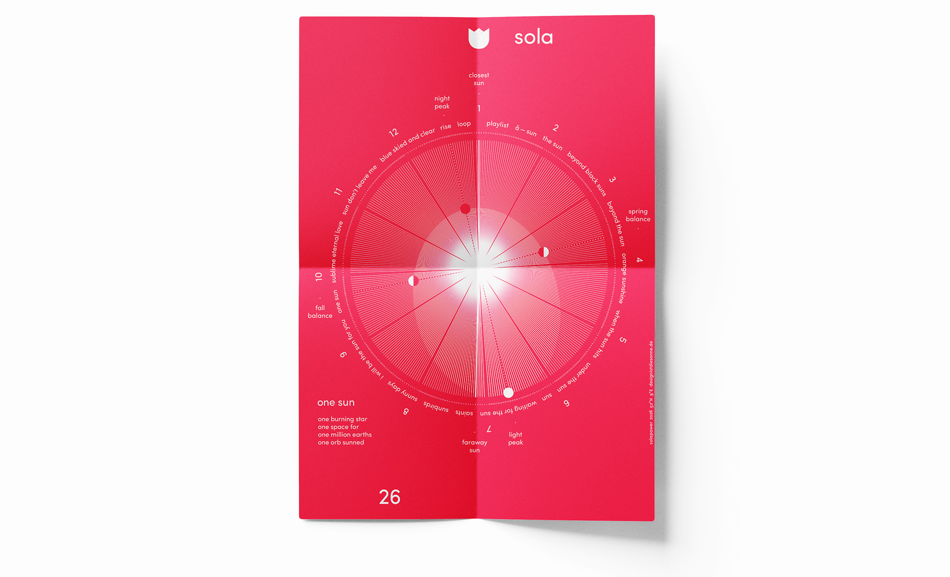 To mark her tenth anniversary as an independent designer, Anja Leidel has created sola, a sun calendar designed as a mailing. In keeping with the fundamental elements of her branding — design is the sun, the abstract tulip — it traces our central source of energy: How big is the sun? When is it close? How much light does the day capture? The two-sided, single-colour folded poster shines best when held up to the light at the window, casting shadows in red. A luminous companion throughout the year, read in a circle. Complemented by an equally loopable playlist called sun, a soundtrack for the morning, for flow, in dark times. Snail mail with good wishes for a sunny 2026.